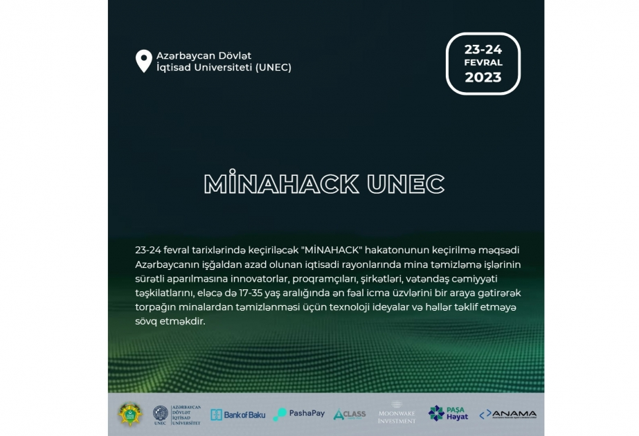 Azərbaycan Dövlət İqtisad Universitetinin (UNEC) təşkilatçılığı, Müdafiə Sənayesi Nazirliyinin Elmi-Tədqiqat İnstitutu və Azərbaycan Minatəmizləmə Agentliyinin (ANAMA) tərəfdaşlığı ilə fevralın 23-24-də ölkədə ilk dəfə olaraq minaların təmizlənməsi mövzusunda “Minahack” hakatonu keçiriləcək.