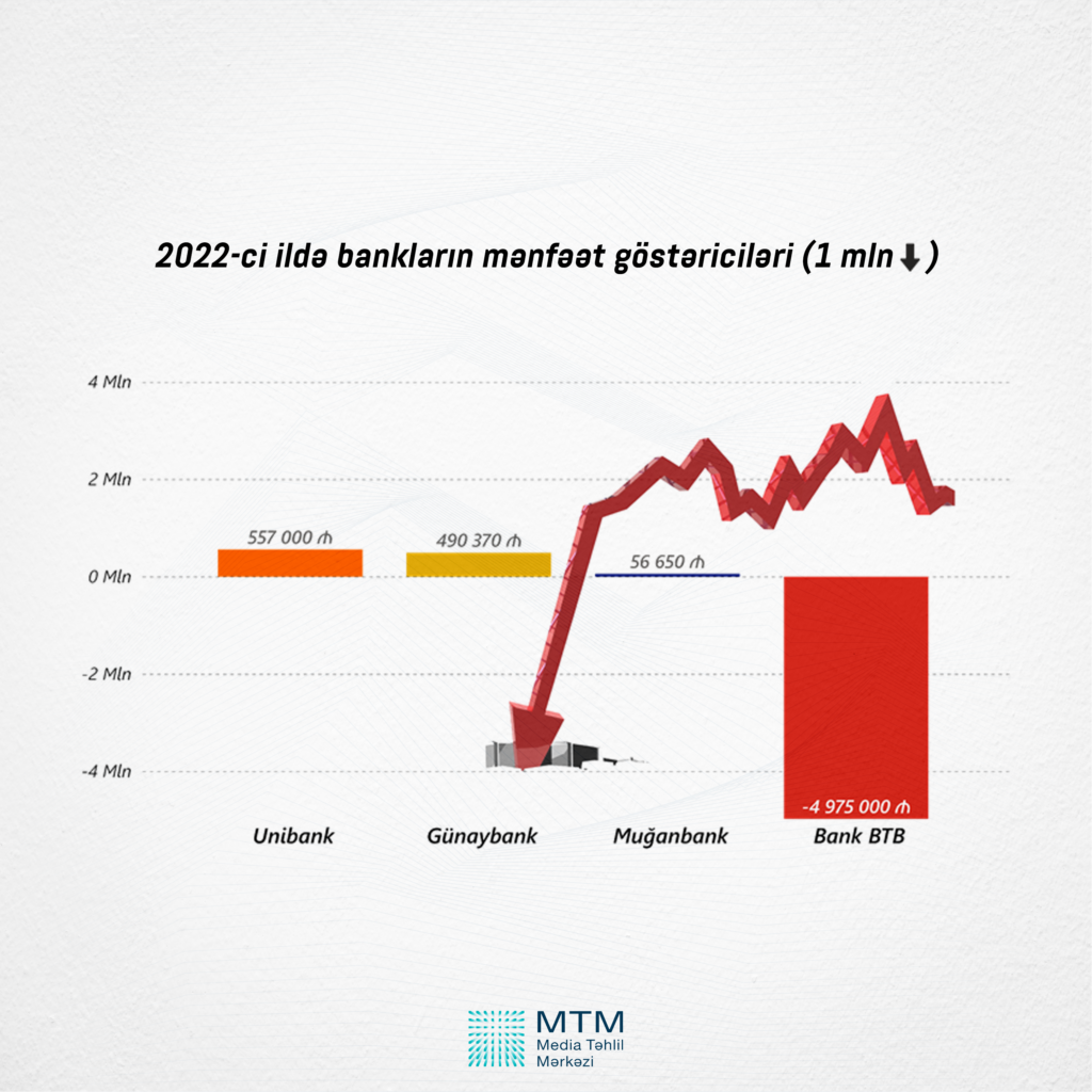 2022-ci ildə 1 milyondan az mənfəət göstəricilərinə malik olan yerli bankların siyahısına diqqət etsək 557 000 manat xalis mənfəətlə Unibankı, 490 370 manat nəticə ilə Günaybankı, 56 650 manat xalis mənfəətlə Muğanbankı və – 4 975 000 manat göstərici ilə ili zərərlə bitirən Bank BTB-ni görə bilərik. İl ərzində əldə etdiyi gəlir göstəricilərinə görə 25 bank arasında 20-ci olan Bank BTB 2022-ci ildə 32 milyon manat gəlir əldə etsə də, xərclərinin çox olmasına görə ili zərərlə yekunlaşdıran yeganə bank olub.
