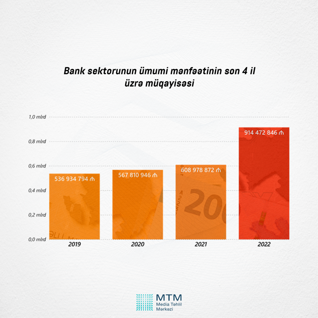 Son dörd ilin göstəricilərinə görə, ölkə üzrə fəaliyyət göstərən bankların ümumi xalis mənfəəti hər il artıb. Ən yüksək artım 50,2% ilə 2022-ci ildə qeydə alınıb. Həmin il yerli bankların ümumi gəliri 914 472 846 manat təşkil edib. Bu da dörd il əvvəlki göstəricilərlə müqayisədə 70,3% çoxdur. Ümumilikdə son dörd ildə ölkə üzrə fəaliyyət göstərən banklar cəmi 2 628 197 458 manat xalis mənfəət əldə ediblər.