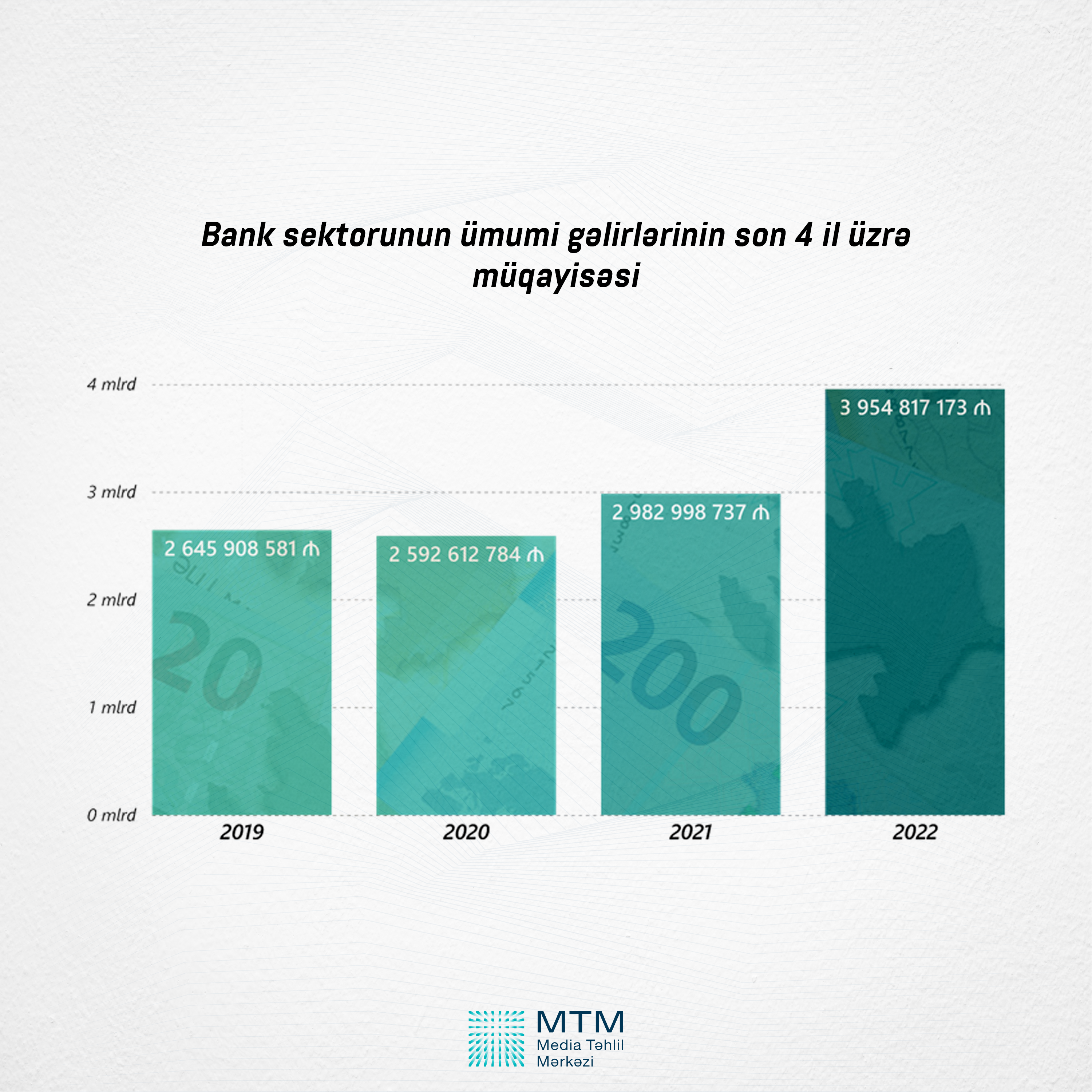 Mərkəzi Bankın və ölkədə fəaliyyət göstərən (25 bank) bankların rəsmi saytlarından əldə olunan məlumatlara görə, 2022-ci ildə ümumilikdə bank sektorunun gəliri xeyli artıb. Belə ki, sözügedən dövrdə banklar 3 954 817 173 manat gəlir əldə edib ki, bu da 2021-ci il ilə müqayisədə 32,6% çoxdur. Artıma səbəb bankların faizlərdən əldə etdiyi gəlirlərdir.