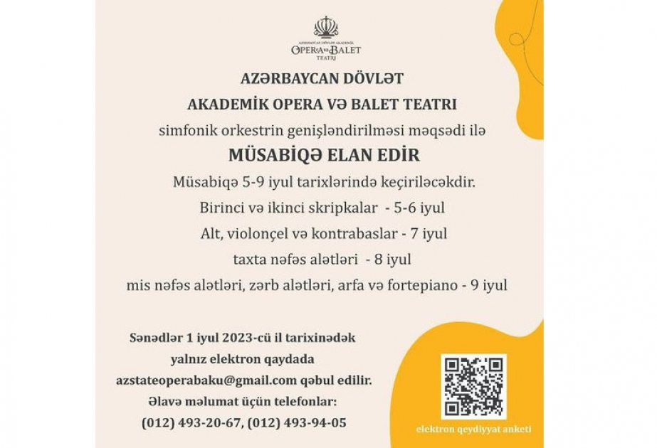 Qeyd edək ki, sənədlər iyulun 1-dən yalnız elektron qaydada azstateoperabaku@gmail.com qəbul edilir. Müsabiqə Azərbaycan Dövlət Akademik Opera və Balet Teatrında keçiriləcək.