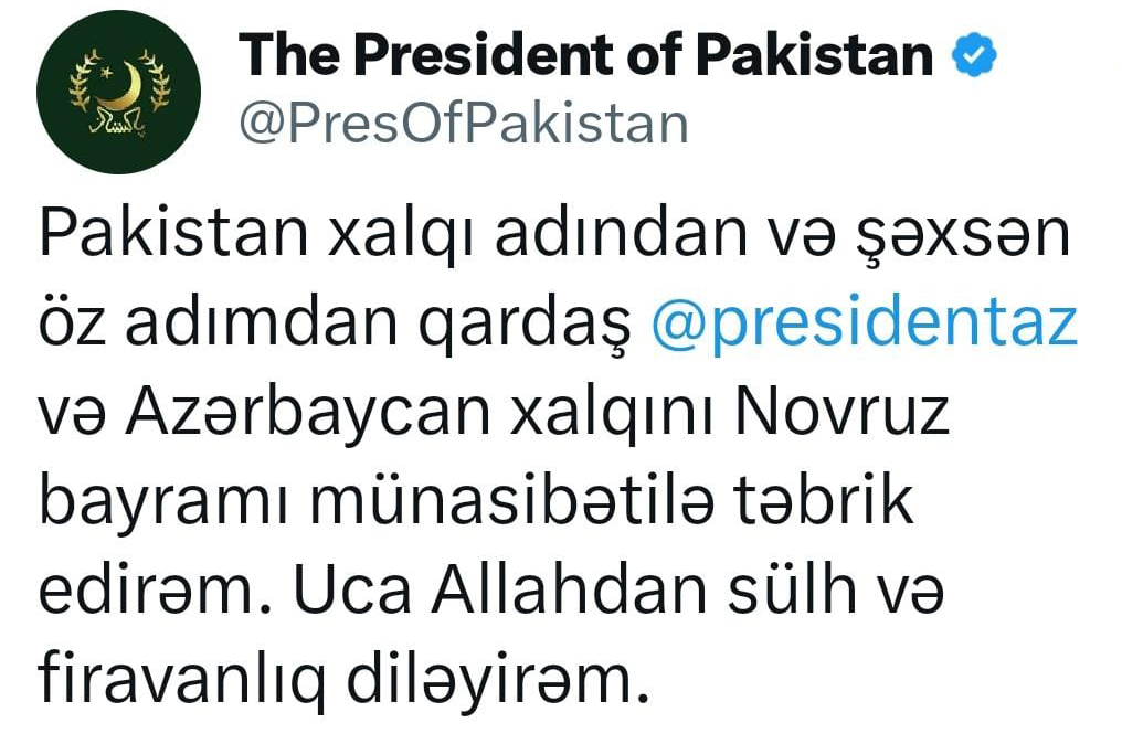 Pakistan Prezidenti bununla bağlı rəsmi tviter hesabında paylaşım edib. Paylaşımda qeyd olunub: “Pakistan xalqı adından və şəxsən öz adımdan Azərbaycan Respublikasının Prezidenti qardaş İlham Əliyevi və Azərbaycan xalqını Novruz bayramı münasibətilə təbrik edirəm. Uca Allahdan sülh və firavanlıq diləyirəm”.