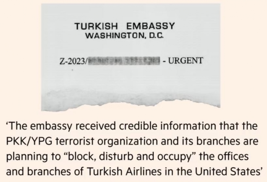 Türkiyə ilə bağlı məxfi sənəddə qeyd olunub ki, “Türkiyənin Vaşinqtondakı səfirliyi PKK/YPG terror təşkilatlarının və onların əlaltılarının “Türk Hava Yolları” aviaşirkətinin ABŞ-də ofisləri və şöbələrinin fəaliyyətinə mane olmaq, onları zəbt etmək, aviaşirkətin əməkdaşlarına problemlər yaratmaq üzrə planlar hazırlaması barədə məlumat əldə edib”.