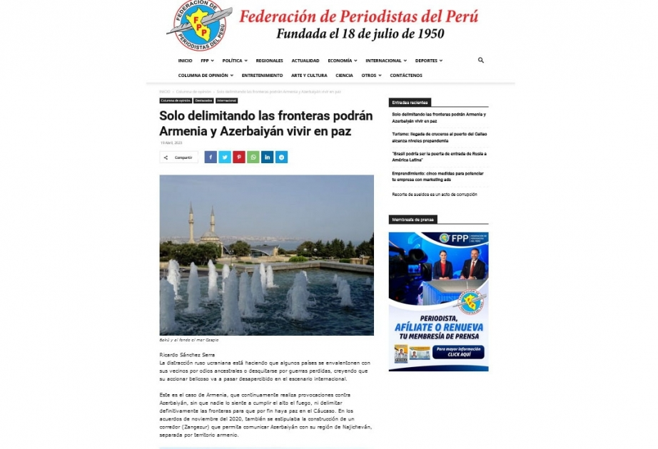 Peru Jurnalistləri Federasiyasının rəsmi portalında qurumun vitse-prezidenti, tanınmış perulu jurnalist Rikardo Sançesin “Yalnız sərhədləri delimitasiya etməklə Ermənistan və Azərbaycan sülh içində yaşaya bilər” sərlövhəli məqaləsi dərc edilib.