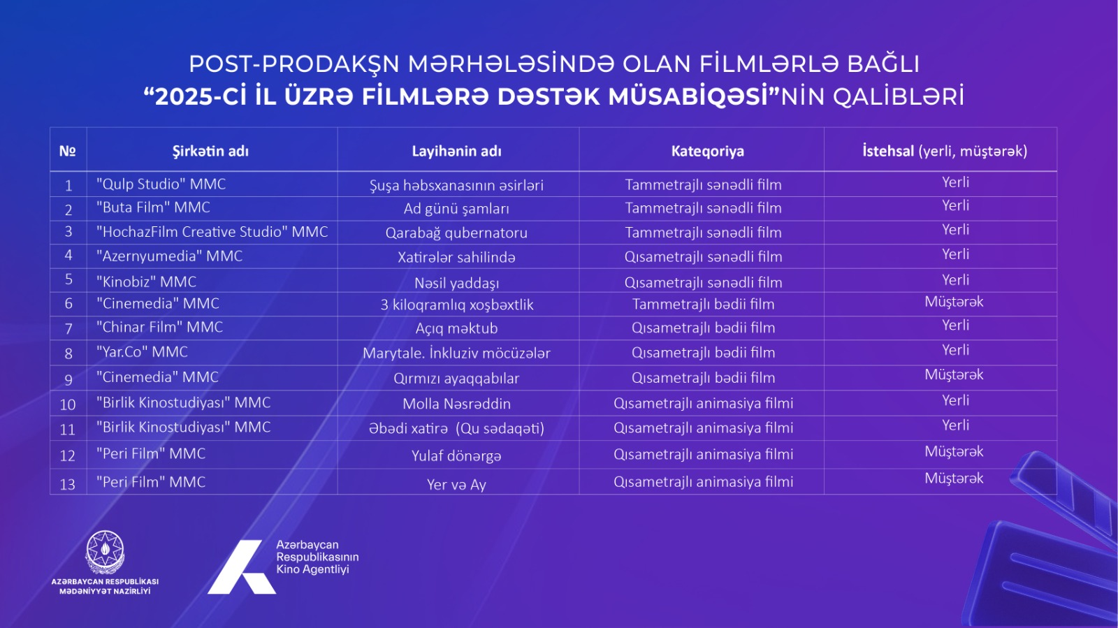 Azərbaycan Respublikası Mədəniyyət Nazirliyi və ARKA-nın post-prodakşn mərhələsində olan filmlərlə bağlı “2025-ci il üzrə filmlərə dəstək müsabiqəsi”nin qalibləri açıqlanıb.