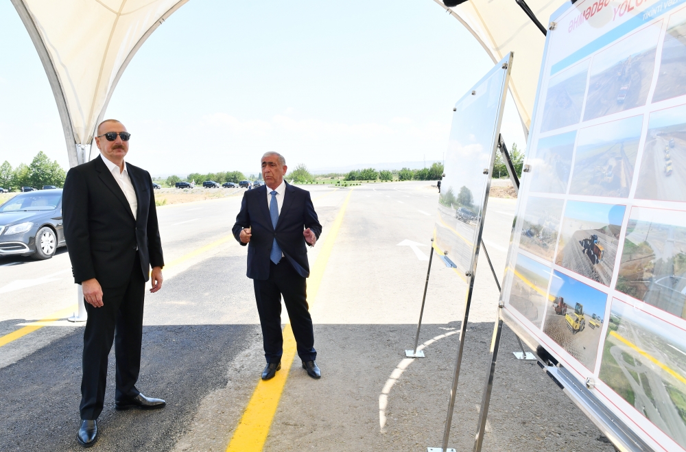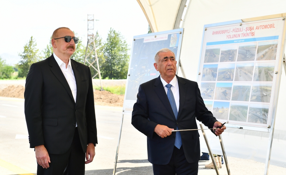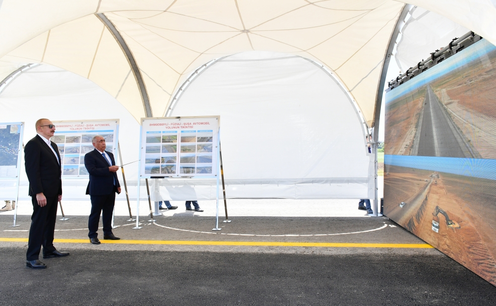 Dövlətimizin başçısı 1-ci texniki dərəcəli Əhmədbəyli-Füzuli-Şuşa avtomobil yolunun Füzuli Beynəlxalq Hava Limanına qədər olan 27 kilometrlik hissəsinin tikintisi ilə tanış olub.
