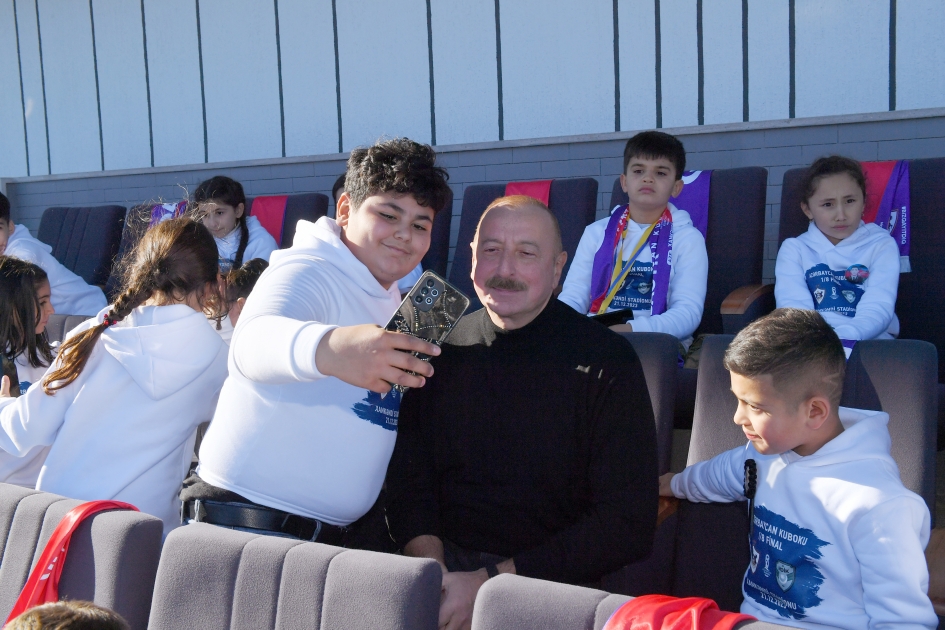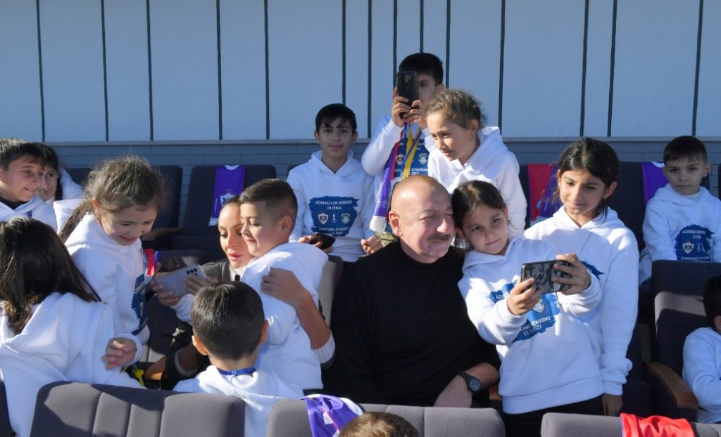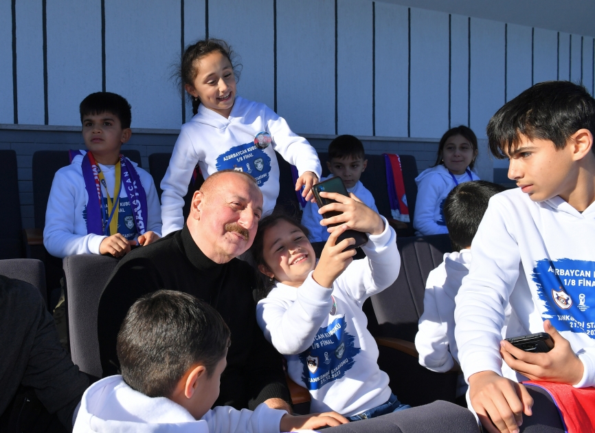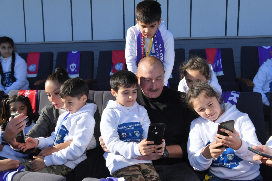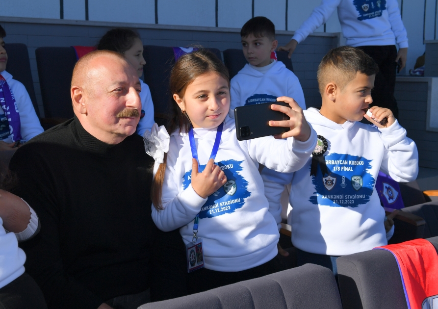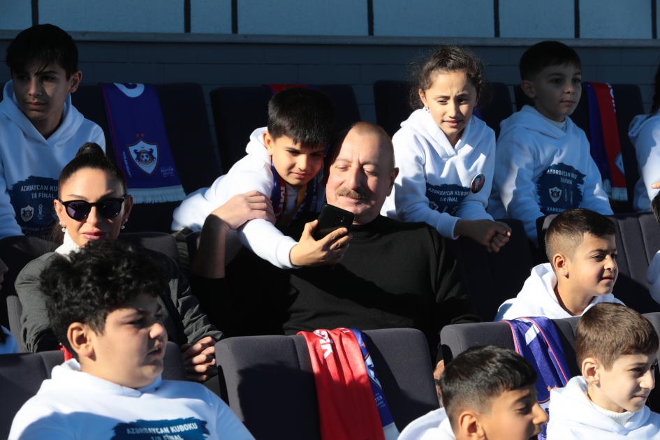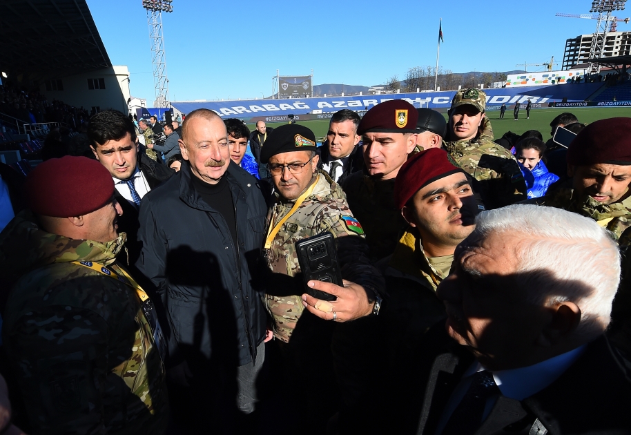 Stadiona daxil olan dövlətimizin başçısı futbolçularla və oyunu idarə edən hakimlərlə görüşdü, onlarla xatirə şəkli çəkdirib.