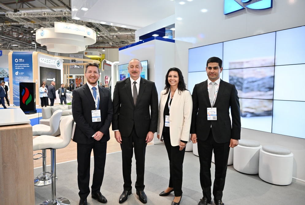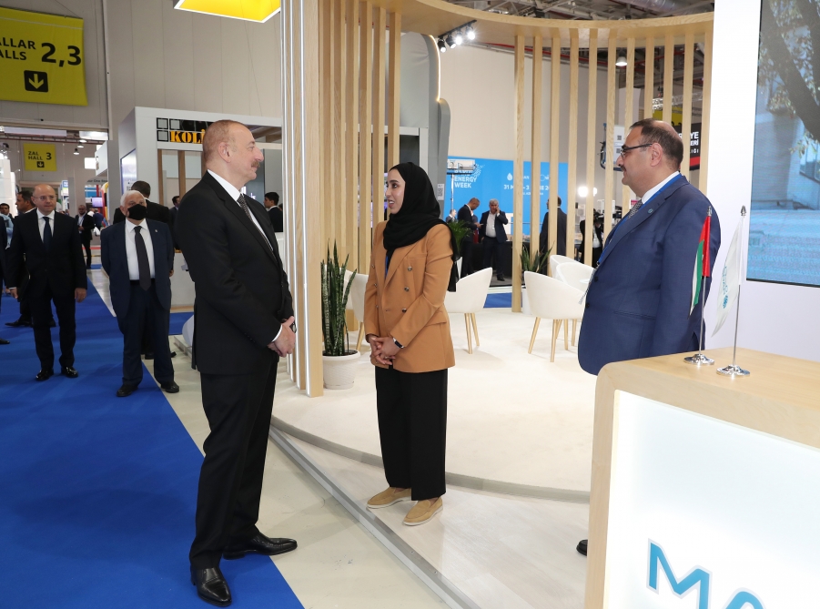 Prezident İlham Əliyev Birləşmiş Ərəb Əmirliklərinin (BƏƏ) “MASDAR” şirkətinin stendinə də baxıb. “MASDAR” bərpa olunan enerji və yaşıl hidrogen texnologiyalarının inkişafını və tətbiqini inkişaf etdirərək dünyada bu sahənin ən qabaqcıl şirkətlərindən biridir. 2006-cı ildə yaradılan “MASDAR” bu gün 40-dan çox ölkədə fəaliyyət göstərir və onlara təmiz enerji məqsədlərinə nail olmaqda və davamlı inkişafda kömək edir. Şirkət Azərbaycanla ümumi gücü 10 qiqavatadək olan bərpaolunan enerji mənbələri layihələri üzrə müqavilələr imzalayıb. Şirkət hazırda gücü 230 meqavat olan Qaradağ Günəş Elektrik Stansiyasının inşası layihəsini icra edir.