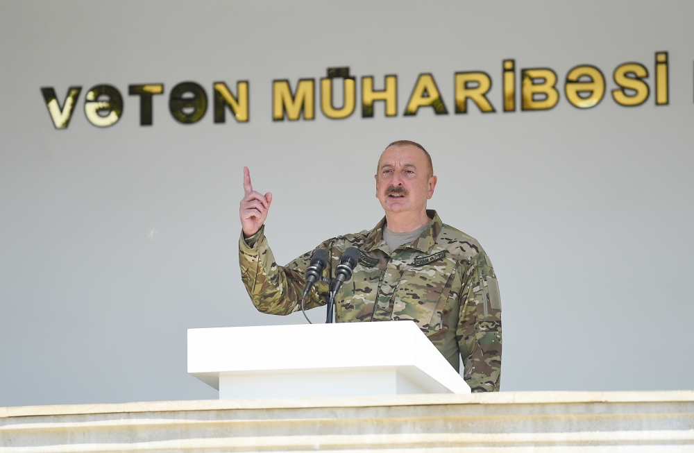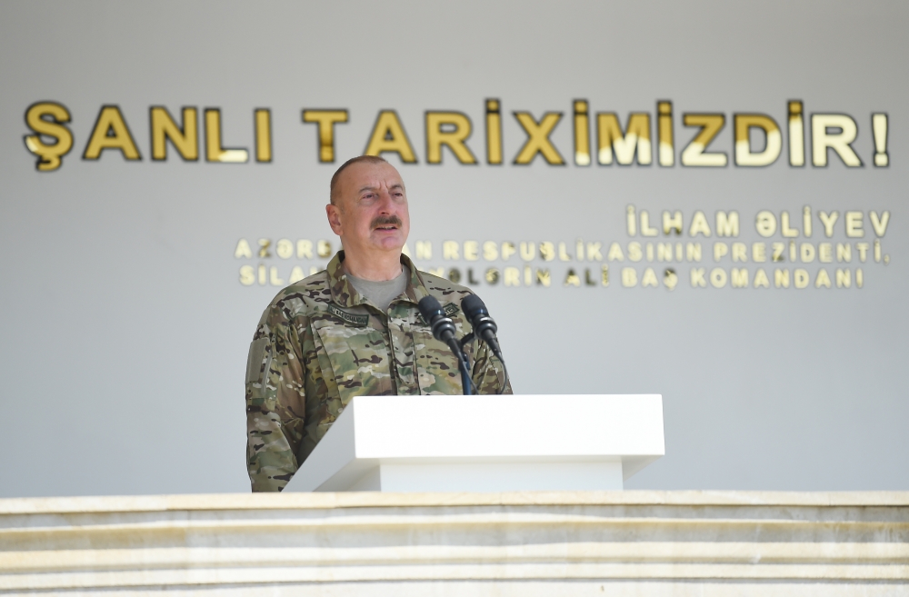 Bu gün biz öz şanlı Zəfərimizi siyasi və diplomatik müstəvidə daha da möhkəmləndirdik. Bu gün biz bölgədə söz sahibiyik. Bəziləri, o cümlədən Ermənistan və onun bəzi xarici himayədarları bizi qisasçılıqda ittiham edirlər. Tamamilə yalan bir tezisdir. Mən demişəm və müharibə dövründə demişəm ki, biz düşməndən qisasımızı döyüş meydanında alacağıq, şəhidlərimizin qanını döyüş meydanında alacağıq və belə də oldu. Azərbaycan Ordusu mülki əhaliyə qarşı müharibə aparmamışdır, bunu hər kəs bilir və görür. Ermənistandan fərqli olaraq onların şəhərlərini “İsgəndər”, “Toçka” və “Elbrus” raketləri ilə dağıtmamışıq. Azərbaycan Ordusu yüksək mənəvi xüsusiyyətlərə malikdir, Ali Baş Komandanın əmrlərini tam icra edir və icra edəcək. Ona görə bizi qisasçılıqda ittiham edənlər qoy gedib güzgüyə baxsınlar. Biz qisas yox, ədalət tələb edirik. Biz tələb edirik ki, haqq-ədalət qorunsun. Biz tələb edirik ki, bizim daxili işlərimizə heç kim müdaxilə etməsin. Biz tələb edirik ki, bütün ölkələr sözdə yox, əməldə bizim ərazi bütövlüyümüzə hörmətlə yanaşsın və belə olan halda biz də onların ərazi bütövlüyünə hörmətlə yanaşacağıq. Əks təqdirdə bizim də addımlarımız adekvat olacaq. Yenə də deyirəm, biz qisasımızı döyüş meydanında aldıq. Ancaq bununla bərabər, biz erməni vəhşiliklərini heç vaxt unutmamalıyıq. İşğal dövründə bizim şəhərlərimiz yerlə-yeksan edilmişdir. Tarixi abidələrimiz dağıdılmışdır. Bizim müqəddəs ocaqlarımız təhqir edilmiş və dağıdılmışdır. Bunu edən bizim mənfur qonşularımız idi. Buna göz yuman beynəlxalq aləm, beynəlxalq ictimaiyyət və indi hər gün Ermənistana baş çəkən rüşvətxor Avropa məmurları və deputatlarıdır. Onları bu ədalətsizliyə vadar edən nədir? İkili standartlar və rüşvət! Bunun başqa izahatı ola bilməz. Gedirlər, bizim sərhədimizə yaxın yerlərdə şəkillər çəkdirirlər, bizə hansısa mesajlar ünvanlayırlar. Hünərləri varsa gəlsin yaxınlaşsın bizim sərhədimizə. O vaxtlar artıq tarixdə qaldı. Yenə də onların ayağını biz qırdıq. Çünki İkinci Qarabağ müharibəsindən sonra biz bunu unutmamışıq. Bəzi Avropa ölkələrinin rəsmi nümayəndələri bizim ərazimizə, Xankəndiyə icazəsiz soxulmuşdular. Mən o vaxt demişdim ki, əgər bizim bundan xəbərimiz olsaydı, onları buraxmayacaqdıq. Bu gün də deyirəm, hünəriniz varsa gəlin, görək, sonra axırınız nə olacaq?