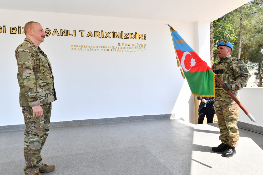 Müzəffər Ali Baş Komandan İlham Əliyev Döyüş bayrağını hərbi hissənin komandirinə təqdim edib.