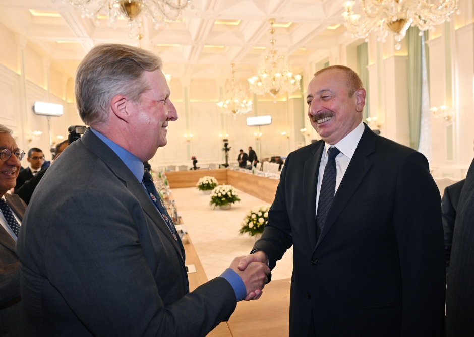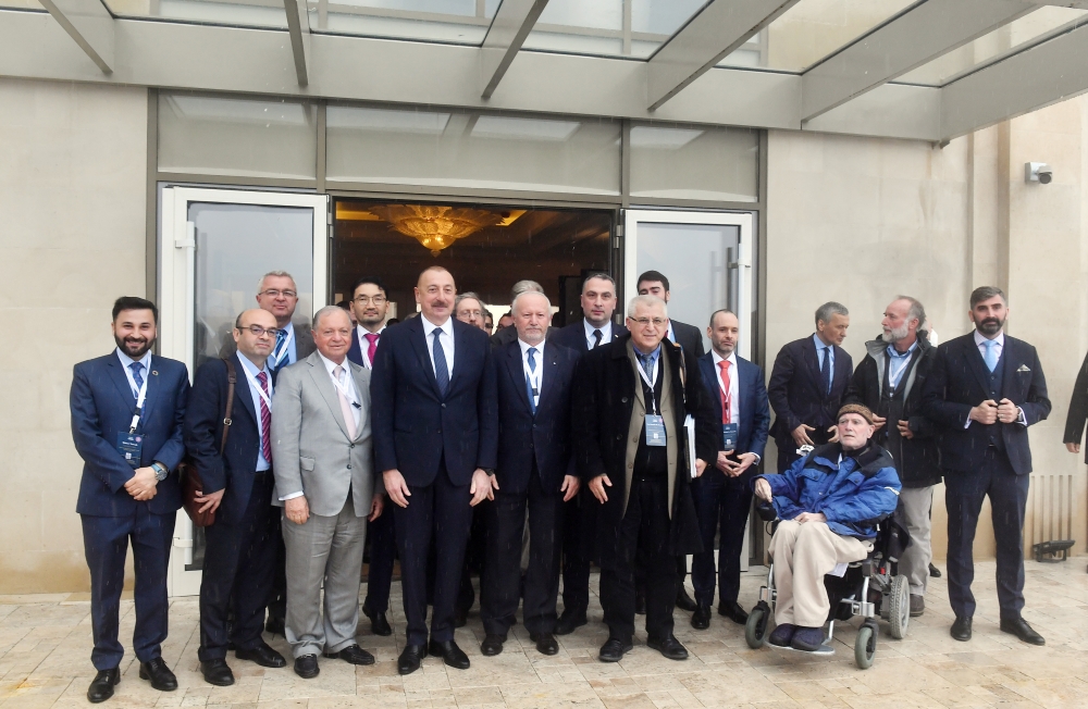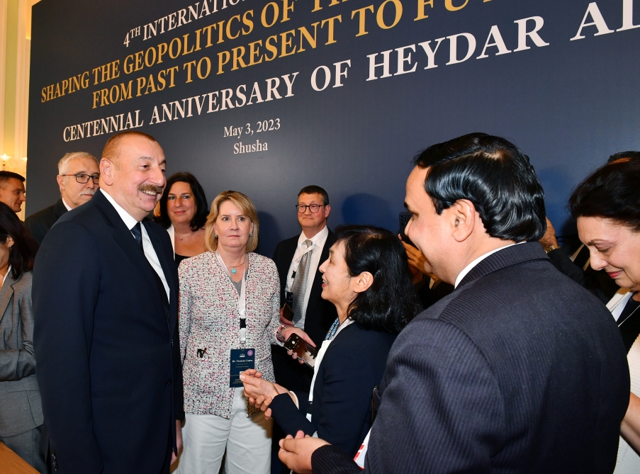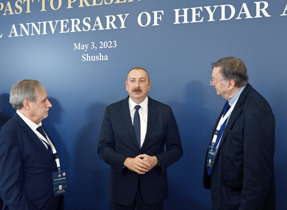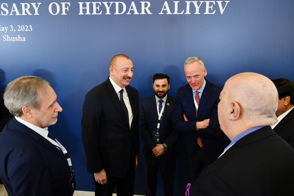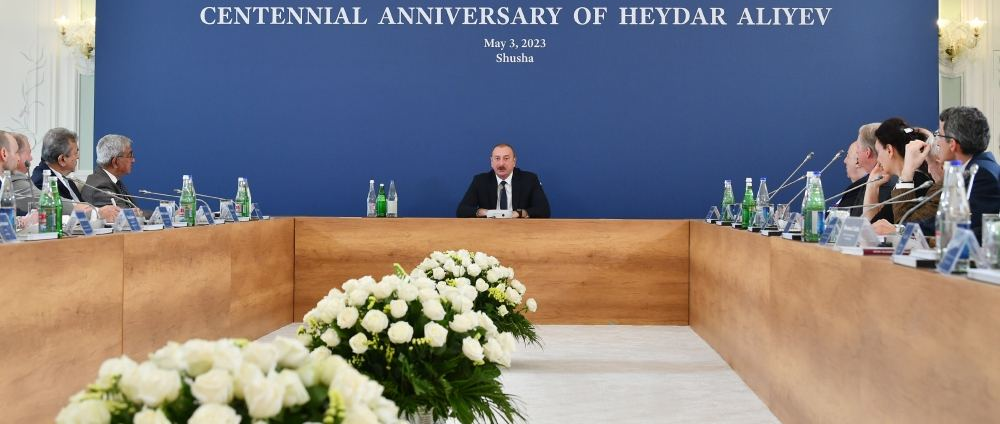 Heydər Əliyev həmişə Azərbaycan xalqının maraqlarını qoruyan bir şəxs olmuşdur və bunu zamana, siyasi vəziyyətə baxmayaraq etmişdir. Sovet Azərbaycanı dönəmində 10 ildən artıq müddətdə Sovet Azərbaycanının rəhbəri olanda və hətta ideoloji əngəllər çərçivəsində o, Azərbaycan xalqının maraqlarını qoruyurdu və milli kimliyimizi saxlaya bilməyimiz üçün əlindən gələni etməyə çalışırdı. Yetmişinci illərdə və səksəninci illərin əvvəlində onun tərəfindən atılmış bir çox addıma nəzər salsaq görərik ki, onlar Azərbaycanın müstəqilliyinə hədəflənmişdir. Beləliklə, əlbəttə ki, onun xatirəsinə həsr olunmuş tədbirlər il ərzində davam edəcək. Biz bu məkanda əsasən Azərbaycanın gələcək inkişafı ilə bağlı olan fikir və ideyaların mübadiləsini aparmaqla praktiki addımları müzakirə etmək istəyirik və regional inkişaf proseslərinə də nəzər salmalıyıq. Çünki biz regionda baş verən proseslərə göz yuma bilmərik. Qarabağın azad edilməsindən sonra ölkə daxilində artıq heç bir risklə üzləşmədiyimizə baxmayaraq, biz adada yaşamırıq. Görüşün Şuşada keçirilməsinin əlbəttə ki, hamımız üçün xüsusi mənası var. Yeri gəlmişkən, keçən ili mən “Şuşa İli” elan etmişdim, çünki bu şəhərin Qarabağ xanı Pənahəli xan tərəfindən yaradılmasının 270-ci il dönümü idi. Şuşa həmişə Azərbaycan şəhəri olmuşdur. Yalnız işğal dövründə iyirmi səkkiz ildən artıq müddət ərzində Şuşa əcnəbi hökmranlıq altında idi. Amma mən bilirəm, siz bizim görüşdən sonra şəhərə ekskursiya edəcəksiniz və özünüz görəcəksiniz ki, işğal dövründə Şuşa demək olar, tamamilə dağıdılmışdır. Bu, bir daha onu göstərir ki, Şuşa heç vaxt ermənilər üçün doğma şəhər olmamışdır.