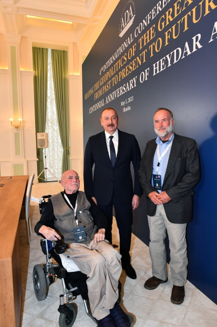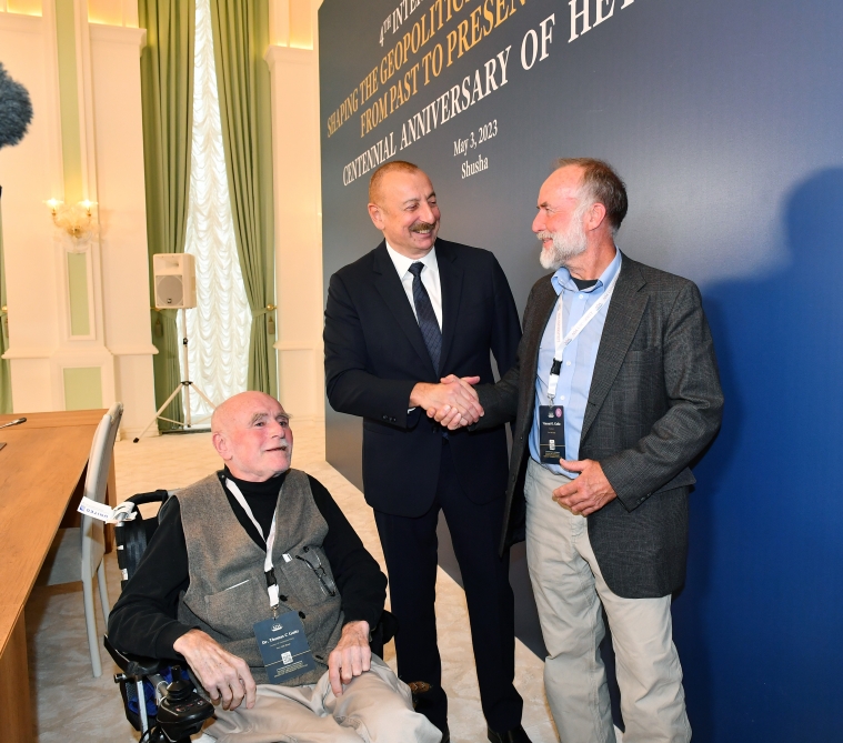 ADA Universitetinin rektoru Hafiz Paşayev: Cənab Prezident, çox sağ olun. Dünən Bakıda, bizim universitetdə çox faydalı müzakirələrimiz oldu. Bu mövzunu müzakirə etmək və Ümummilli Liderimizin 100 illik yubileyini qeyd etmək üçün altmışdan çox elm adamı və politoloq Bakıya gəlib. Bizim çox yaxşı müzakirələrimiz olub. Özüm də daxil olmaqla biz möhtəşəm şəhərdə, Türk dünyasının mədəniyyət paytaxtı Şuşada olmaq fürsətinə görə çox sevinirik. İndi biz burdayıq, çox xoşbəxtik. Konfransın altmış iştirakçısından ən azından yarısı ilk dəfədir ki, bizim tədbirdə iştirak edir. İcazənizlə müzakirəyə keçmək istərdik. Əvvəlcə sual vermək üçün sözü ABŞ-ın Prinston Universitetindən olan Maykl Reynoldsa vermək istəyirəm. Onun sualı var.