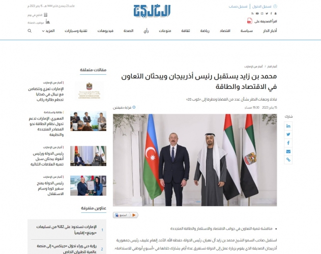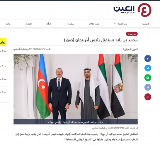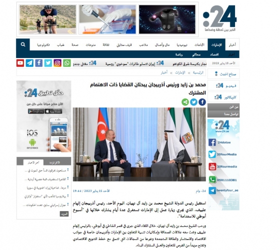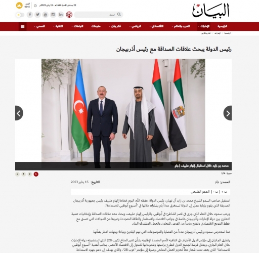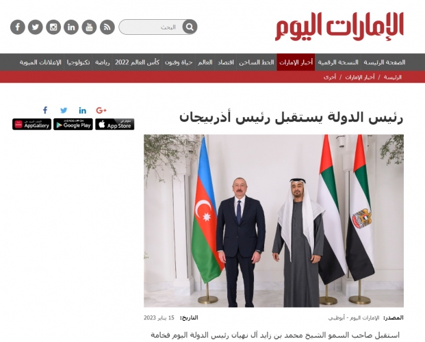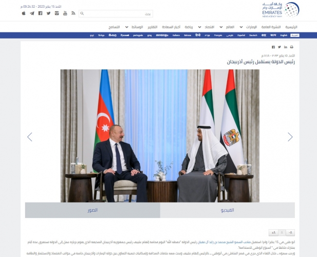 BƏƏ-nin WAM agentliyi, “Emarat əl Yom”, “Əl İttihad”, “Əl Xalic”, “Əl Bəyan”, “24.ae”, “Al-Ayn”, “Emarat News” qəzet və portallarında Əbu-Dabidəki Əl-Şati sarayında Prezident İlham Əliyevin Birləşmiş Ərəb Əmirliklərinin Prezidenti Şeyx Məhəmməd bin Zayed Al Nəhyan ilə görüşü haqqında geniş xəbərlər və məqalələr dərc edilib.