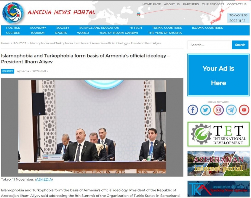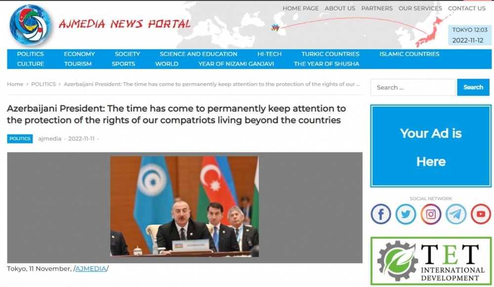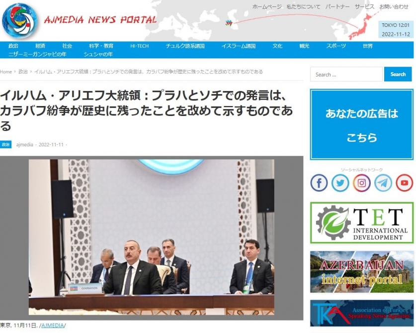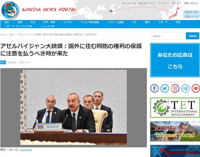 Yaponiyanın “ajmedia.jp” portalı Azərbaycan Prezidenti İlham Əliyevin Səmərqənddə Türk Dövlətləri Təşkilatının (TDT) IX Zirvə Görüşündə çıxışını geniş işıqlandırıb.