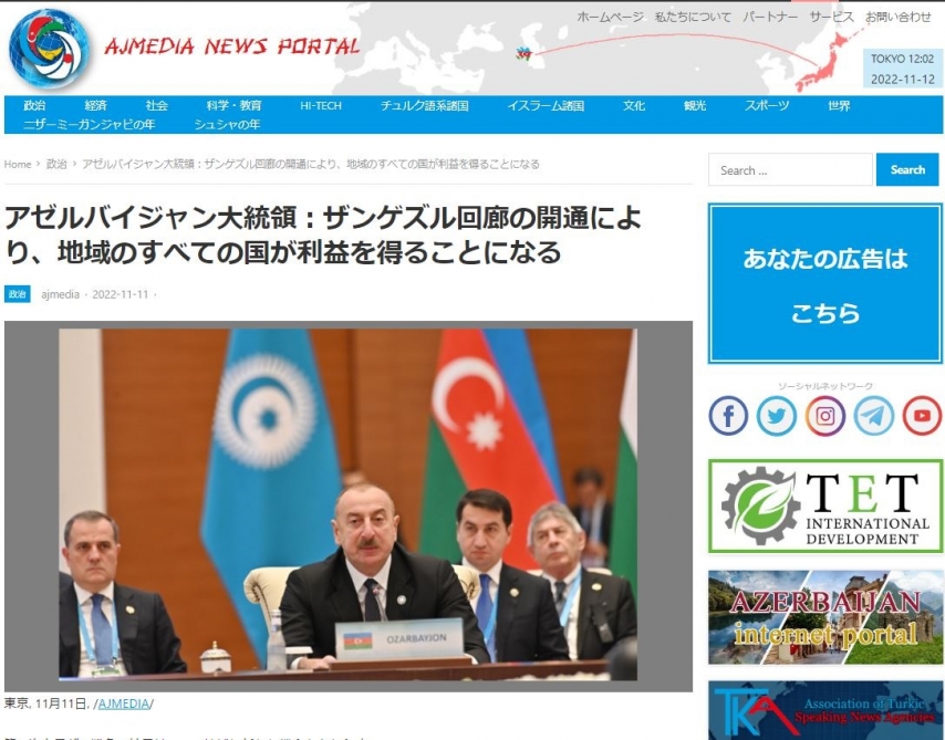 Yaponiya portalı, həmçinin məcburi köçkünlərin Qarabağa və Şərqi Zəngəzura Böyük Qayıdışı ilə əlaqədar aparılan nəhəng bərpa və quruculuq işləri barədə Prezident İlham Əliyevin fikirlərinə diqqət çəkib və Azərbaycan liderinin türk dövlətləri başçılarını Qarabağa və Şərqi Zəngəzura səfərə dəvət etməsindən yazıb.