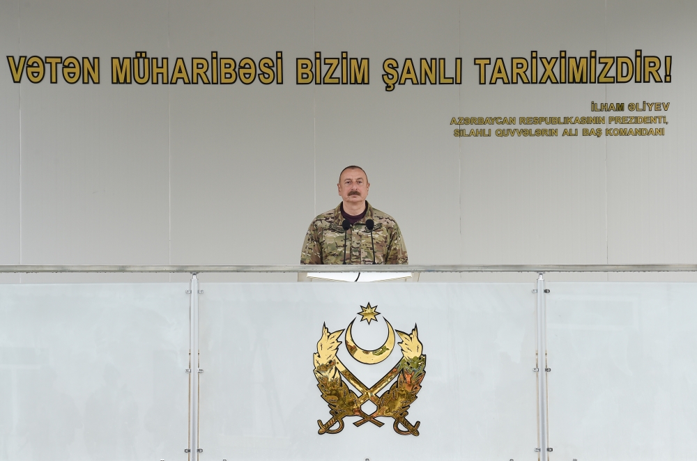 Müharibədən sonra bu gün Azərbaycan Ordusu daha güclüdür – həm təchizat nöqteyi-nəzərdən, həm də döyüş qabiliyyəti nöqteyi-nəzərdən. Ona görə biz bundan sonra da Ordumuzun inkişafı üçün ciddi addımlar atacağıq. Ən müasir silahları almaq üçün yeni kontraktlar imzalandı. Bu kontraktlar artıq icra olunur, yeni silahlar, ən müasir texnika Azərbaycana gətirilir və gətiriləcək. Ermənistanla sərhəddə bizim mövqelərimiz daha da möhkəmlənəcək. Əgər Ermənistan sərhədlərin müəyyən edilməsi işində yenə də öz köhnə taktikasına qapılsa, vaxt uzatmağa çalışsa, nəticədə özü peşman olacaq. Biz Ermənistanda baş qaldıran revanşist qüvvələrin hərəkətlərinə diqqətlə baxırıq. Onlar da bunu bilsinlər. Bax, o dağın başında mənim sözlərim yazılıb: “Dəmir yumruq” yerindədir, bunu heç kim unutmasın”.