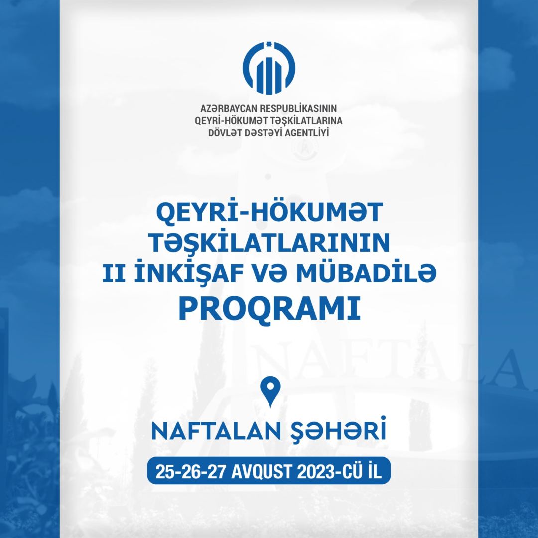 Azərbaycan Respublikasının Qeyri-Hökumət Təşkilatlarına Dövlət Dəstəyi Agentliyi ictimai birliklərin inkişafına dəstək məqsədilə “QHT-lərin II İnkişaf və Mübadilə proqramı”nı elan edir. 25-27 avqust 2023-cü il tarixlərində proqram çərçivəsində Naftalan şəhərində 3 günlük təlimlər təşkil olunacaq.