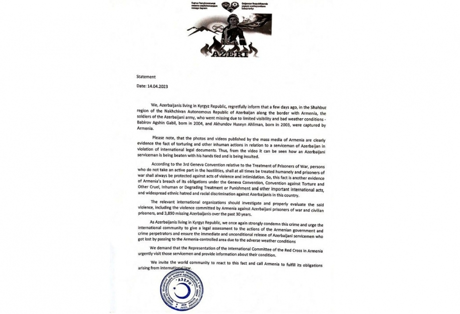 Diasporla İş üzrə Dövlət Komitəsindən bildiriblər ki, birliyin adından Qırğızıstan ictimaiyyətinə və beynəlxalq təşkilatlara ünvanlanan bəyanatda Ermənistan tərəfindən əsir götürülmüş Azərbaycan Ordusunun əsgərləri – 2004-cü il təvəllüdlü Bəbirov Aqşin Qabil oğlunun və 2003-cü il təvəllüdlü Axundov Hüseyn Əhliman oğlunun Ermənistana əsir düşməsi səbəblərinə aydınlıq gətirilib, onlara qarşı qeyri-insani rəftara diqqət cəlb edilib.