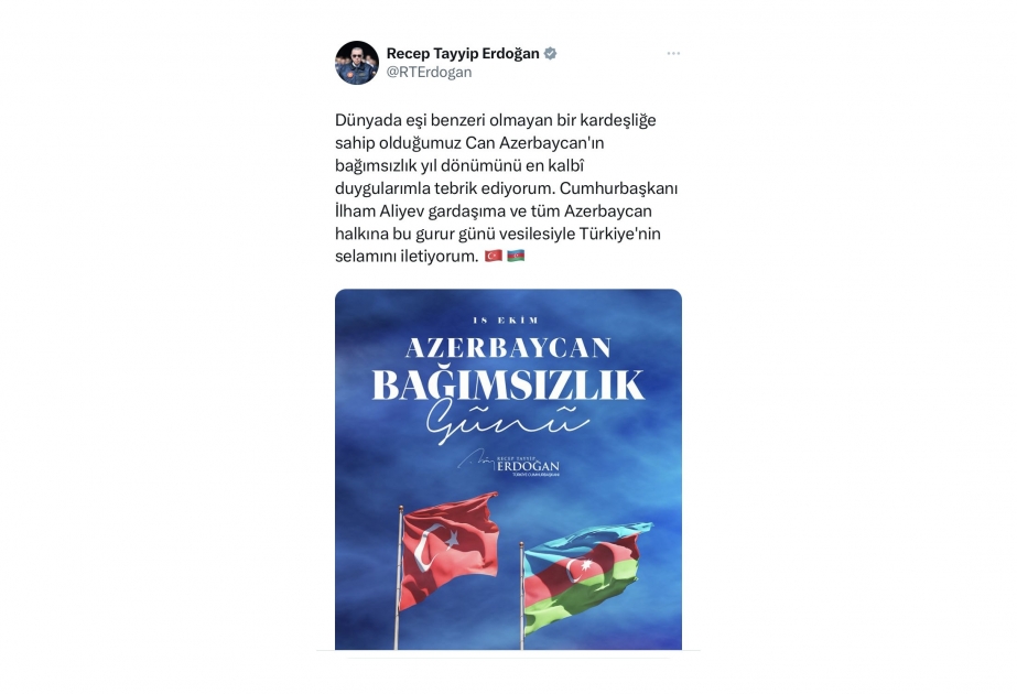 Türkiyə Prezidenti Rəcəb Tayyib Ərdoğan Müstəqilliyin Bərpası Günü münasibətilə Azərbaycanı təbrik edib.