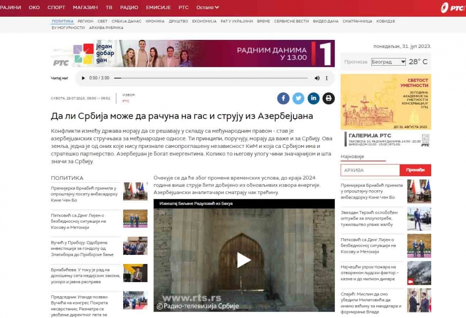 Serbiyanın “RTS” radio-televiziya kanalında Azərbaycanın enerji resurslarının bu ölkəyə mümkün idxalının əhəmiyyətindən bəhs edən reportaj yayımlanıb.