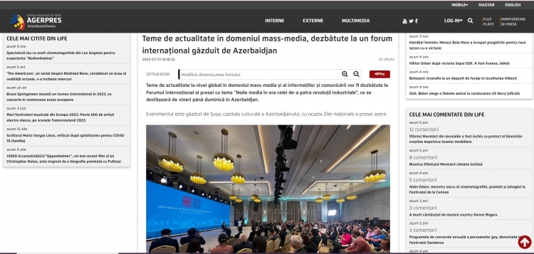 Məqalələrdə cümə günündən bazar gününə kimi keçiriləcək tədbirlərdə kütləvi informasiya vasitələri və informasiya-kommunikasiya sahəsində qlobal səviyyədə aktual mövzuların müzakirə olunduğu qeyd edilir. Bildirilir ki, Milli Mətbuat Günü münasibətilə tədbir Azərbaycanın mədəniyyət paytaxtı Şuşada keçirilir. Diqqətə çatdırılıb ki, Azərbaycan Prezidenti İlham Əliyev cümə günü 50 ölkədən olan 120 media qurumunu təmsil edən 200-dən çox qonaq, o cümlədən AGERPRES-in baş direktoru Klaudiya Nikolae ilə də görüşüb. Dövlət başçısı çıxışında bildirib ki, Azərbaycanda kütləvi informasiya vasitələrinin müstəqilliyi cəmiyyətin inkişafı üçün ən mühüm şərtlərdən biridir.