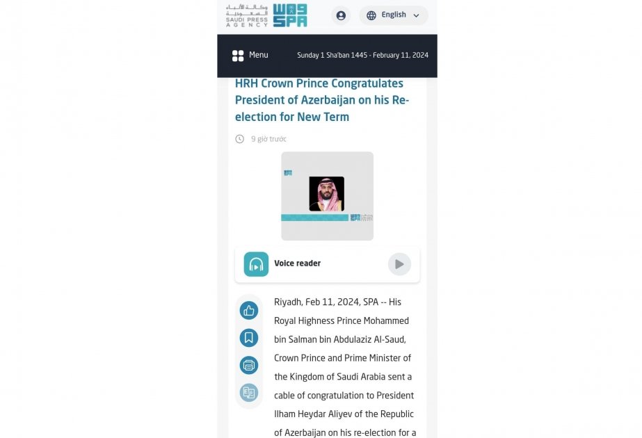 Səudiyyə Ərəbistanı Krallığının vəliəhdi, Baş nazir Məhəmməd bin Salman bin Əbdüləziz Al Səud Azərbaycan Respublikasının Prezidenti İlham Əliyevi seçkilərdə qazandığı inamlı qələbə münasibətilə təbrik edib.