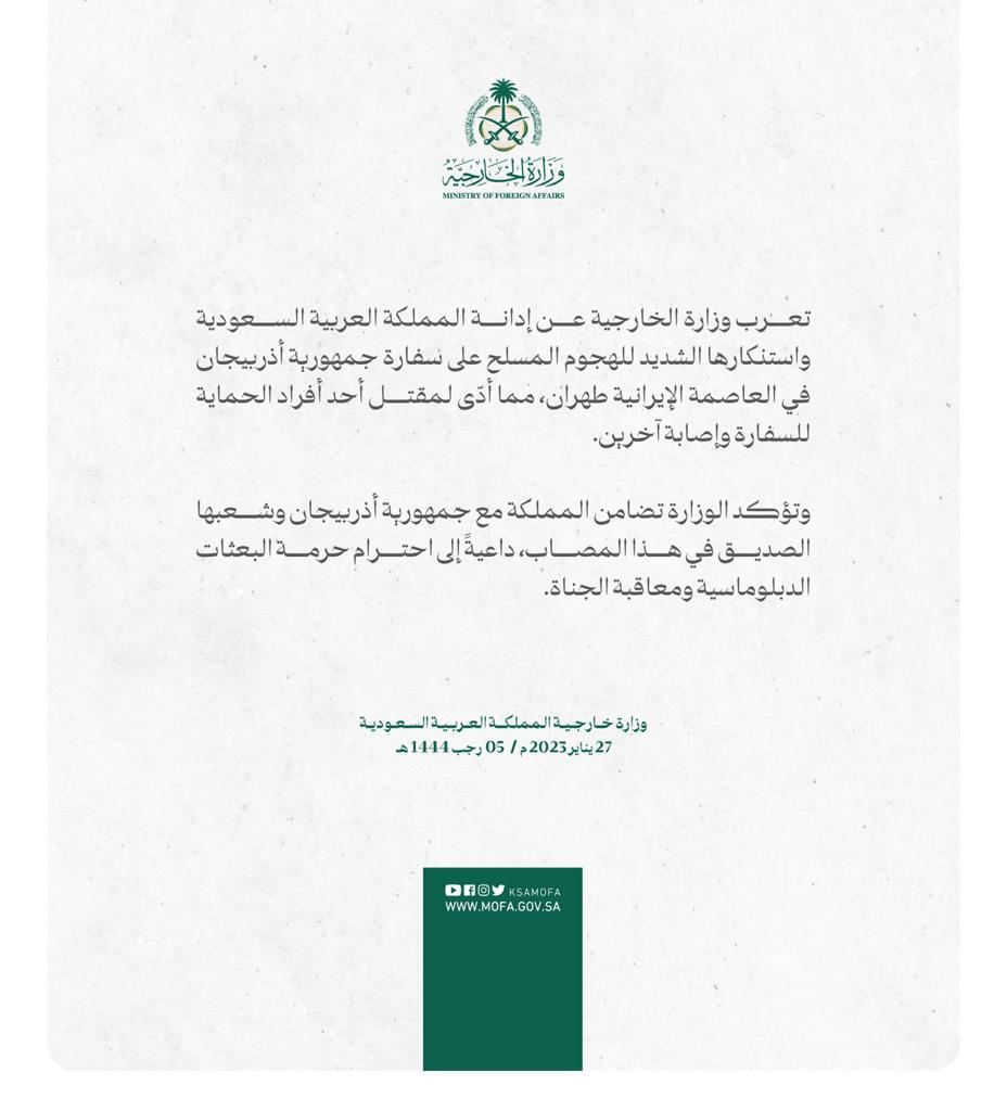 Səudiyyə Ərəbistanı Krallığının Xarici İşlər Nazirliyi (XİN) İranın paytaxtı Tehranda Azərbaycan Respublikasının səfirliyinə silahlı hücumu şiddətlə pislədiyini bildirir.