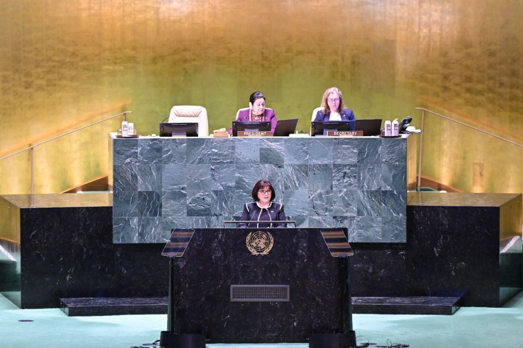 Milli Məclisin sədri Sahibə Qafarova Amerika Birləşmiş Ştatlarının Nyu-York şəhərinə işgüzar səfəri çərçivəsində Birləşmiş Millətlər Təşkilatında (BMT) keçirilən “Dayanıqlı İnkişaf Məqsədlərinə nail olunmasında transformativ həll yolu kimi sıfır tullantıların rolu” mövzusunda keçirilən yüksək səviyyəli iclasda iştirak edib.
