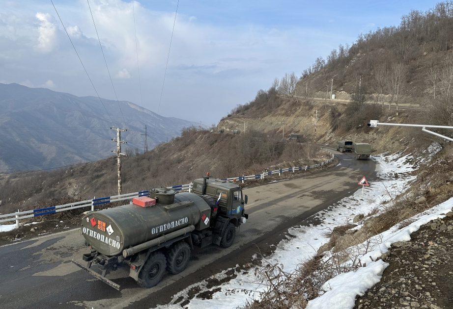 Rusiya sülhməramlılarına məxsus avtomobillər Laçın-Xankəndi yolunda dinc aksiya keçirilən ərazidə maneəsiz hərəkət edirlər.