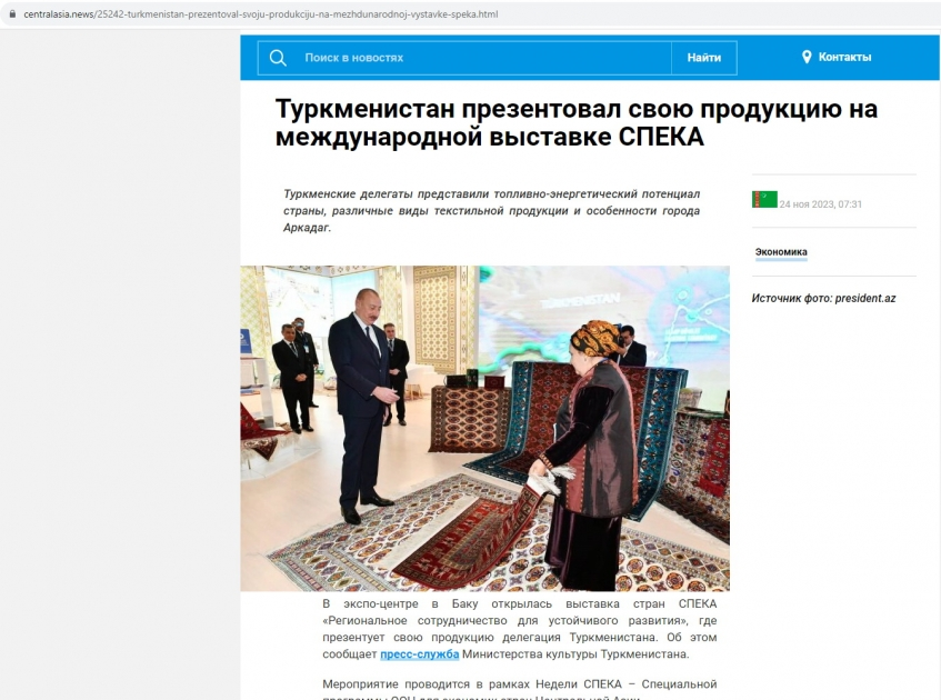 Türkmənistan KİV-ləri vurğulayıblar ki, SPECA-nın 25 illik yubileyi münasibəti ilə təşkil olunan sərginin açılışında Azərbaycan Prezidenti İlham Əliyev iştirak edib. O, Türkmənistan stendinə baxıb və burada dövlət müəssisləri və özəl şirkətlərin istehsal etdiyi məhsulların nümunələri ilə tanış olub.