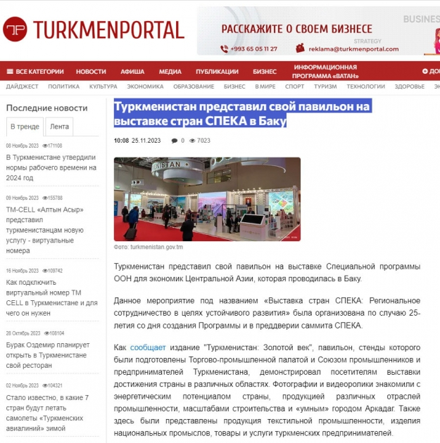 Materiallarda vurğulanır ki, SPECA sammiti ərəfəsində təşkil olunan sərgidə iştirakçı dövlətlər iqtisadi potensiallarını və müxtəlif sahələrdə qarşılıqlı faydalı əməkdaşlığın genişləndirilməsi imkanlarını təqdim ediblər. Türkmənistanın Ticarət-Sənaye Palatası və Sənayeçilər və Sahibkarlar İttifaqı tərəfindən hazırlanan Türkmənistan pavilyonunun stendləri sərgiyə gələnlərə ölkənin müxtəlif sahələrdə əldə etdiyi nailiyyətləri nümayiş etdirib. Foto və videoçarxlar respublikanın enerji potensialını, müxtəlif sənaye sahələrinin məhsullarını, tikinti miqyasını və “ağıllı” Arkadağ şəhərini təqdim edib. Burada, həmçinin toxuculuq sənayesi məhsulları, milli sənətkarlıq məmulatları, türkmən sahibkarlarının mal və xidmətləri təqdim olunub.