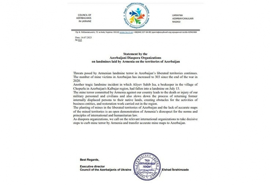 Diasporla İş üzrə Dövlət Komitəsindən bildiriblər ki, UAR adından beynəlxalq təşkilatlara ünvanlanan bəyanatda Kəlbəcər rayonunun Seyidlər kəndi ərazisində arıçılıq fəaliyyəti ilə məşğul olan Sahib Əliyevin iyulun 13-də mina partlayışı nəticəsində xəsarət alması barədə məlumat verilib. Qeyd edilib ki, bu dəhşətli hadisə Ukraynada yaşayan soydaşlarımızda hiddət və dərin narahatlıq doğurub.
