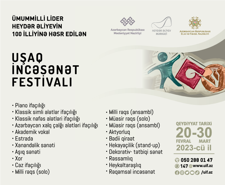 Mədəniyyət Nazirliyi, Elm və Təhsil Nazirliyi, Heydər Əliyev Mərkəzinin birgə təşkilatçılığı ilə Azərbaycan xalqının ümummilli lideri Heydər Əliyevin 100 illik yubileyinə həsr edilən Birinci Uşaq İncəsənət Festivalı keçiriləcək.