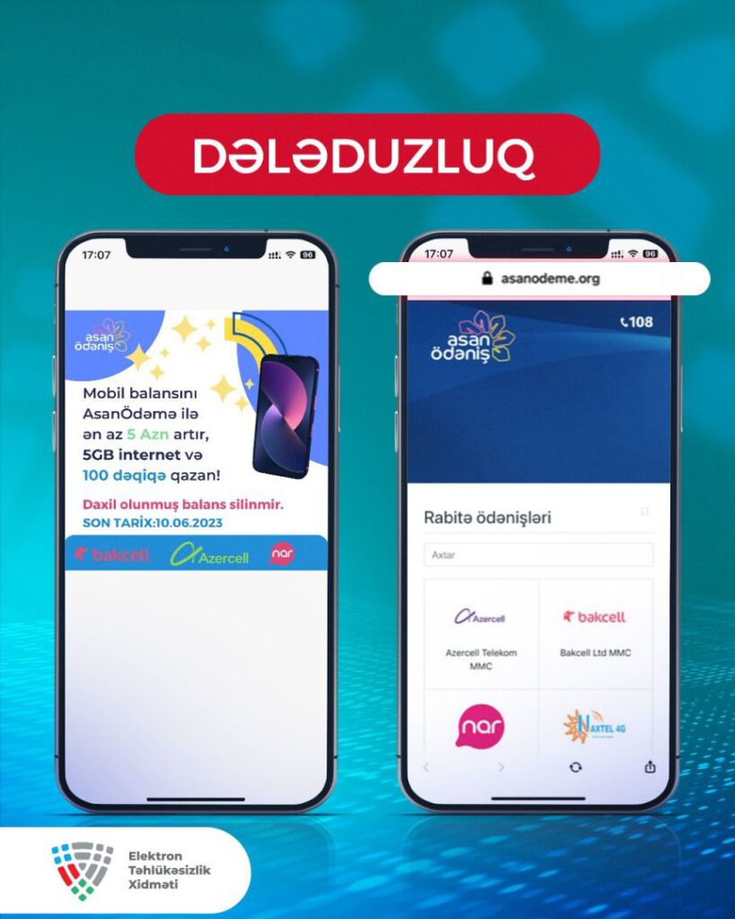 Kiberdələduzlar tərəfindən “ASAN ödəniş” sistemi adından “asanodeme.org” adlı saxta veb-səhifə yaradılaraq vətəndaşlara pulsuz mobil internet və danışıq dəqiqələri qazanmaları təklif edilir.