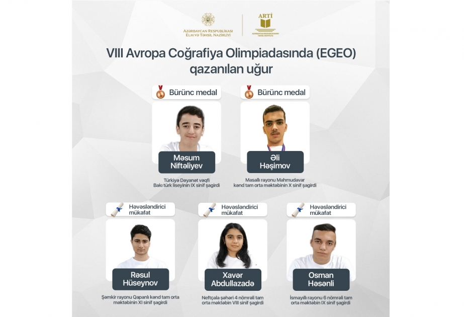 VIII Avropa Coğrafiya Olimpiadasında (EGEO) məktəblilərimiz 2 bürünc medal və 3 həvəsləndirici mükafat qazanıblar.