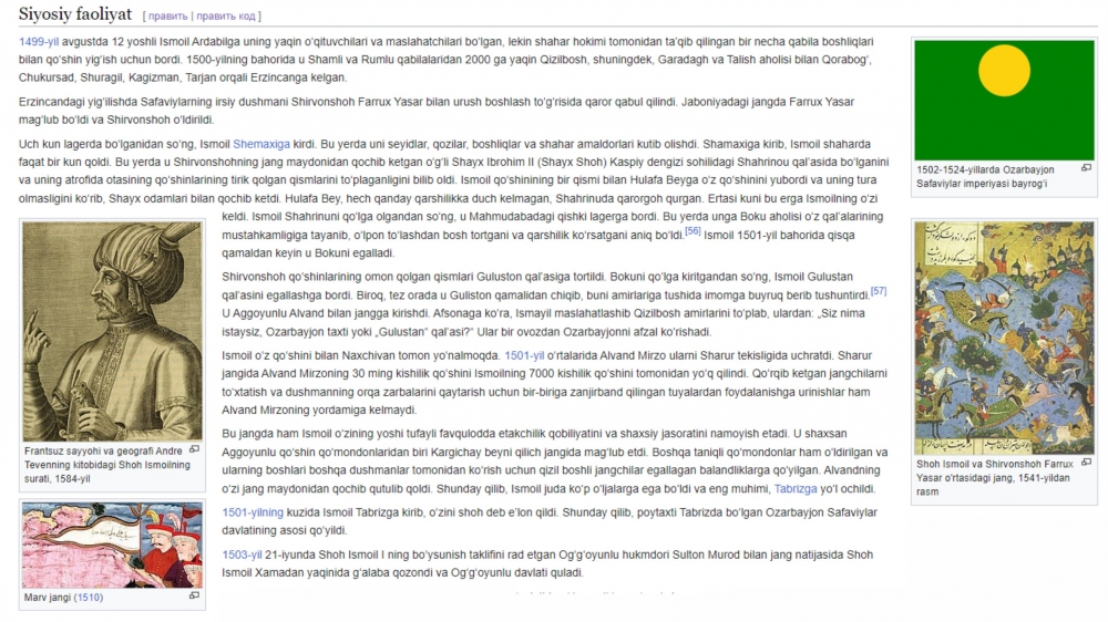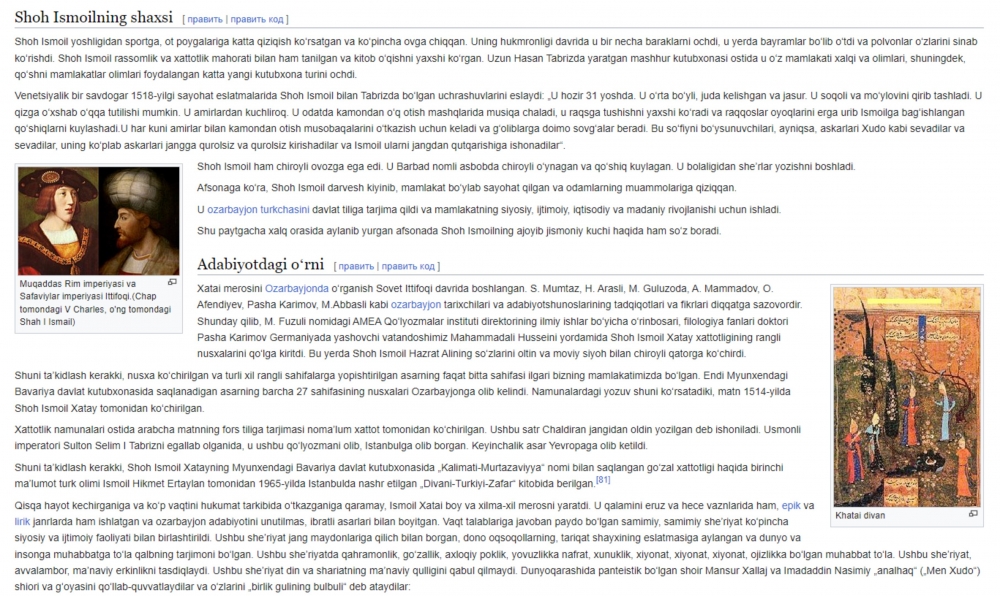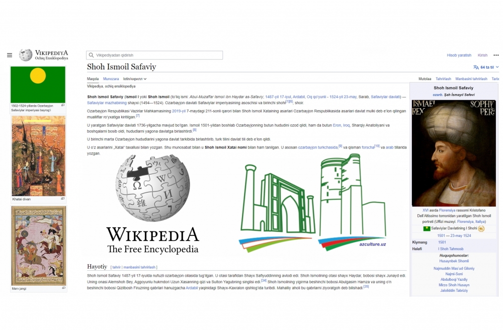 Özbəkistandakı Heydər Əliyev adına Azərbaycan Mədəniyyət Mərkəzinin layihəsi ilə Azərbaycan Səfəvi imperiyasının banisi və birinci şahı, ilk dəfə olaraq Azərbaycan ərazilərini vahid dövlətdə birləşdirən və Azərbaycan türkcəsini dövlət dili elan edən hökmdar, şair Şah İsmayıl Səfəvi haqqında “Wikipediya” Beynəlxalq Elektron Ensiklopediyasında özbək dilində “Shoh Ismoil Safaviy” adlı bölmə istifadəyə verilib.