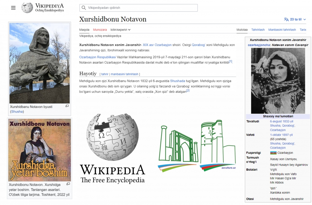 Azərbaycanın Şuşa şəhərinin 2023-cü ildə “Türk dünyasının mədəniyyət paytaxtı” elan edilməsi münasibətilə Özbəkistandakı Heydər Əliyev adına Azərbaycan Mədəniyyət Mərkəzinin layihəsi ilə XIX əsr Azərbaycanın bədii fikrinin görkəmli siması Xurşidbanu Natəvan haqqında “Wikipediya” Beynəlxalq Elektron Ensiklopediyasında özbək dilində “Xurshidbonu Notavon” adlı bölmə istifadəyə verilib.