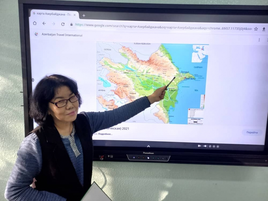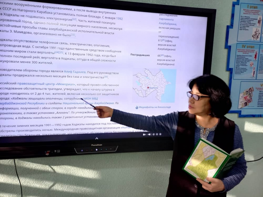 Əvvəlcə məktəbin tarix müəllimi Moldokulova S.K. xəritədə Azərbaycanı, Qarabağı, Xocalını göstərib və Xocalı soyqırımı haqqında şagirdlərə geniş məlumat verib.