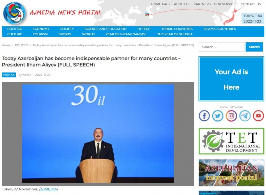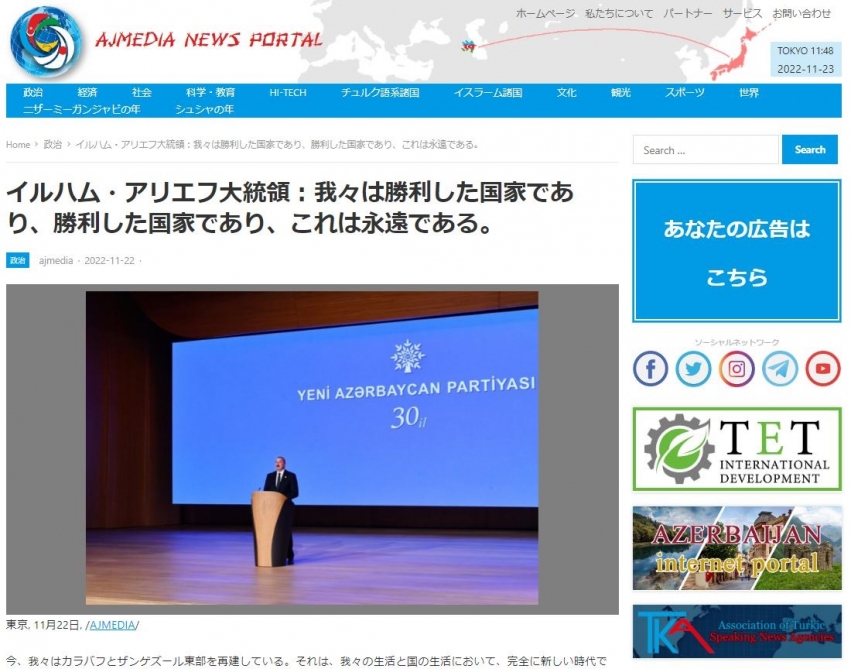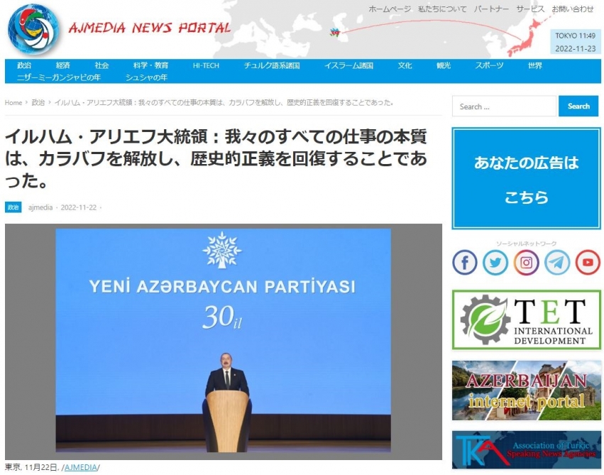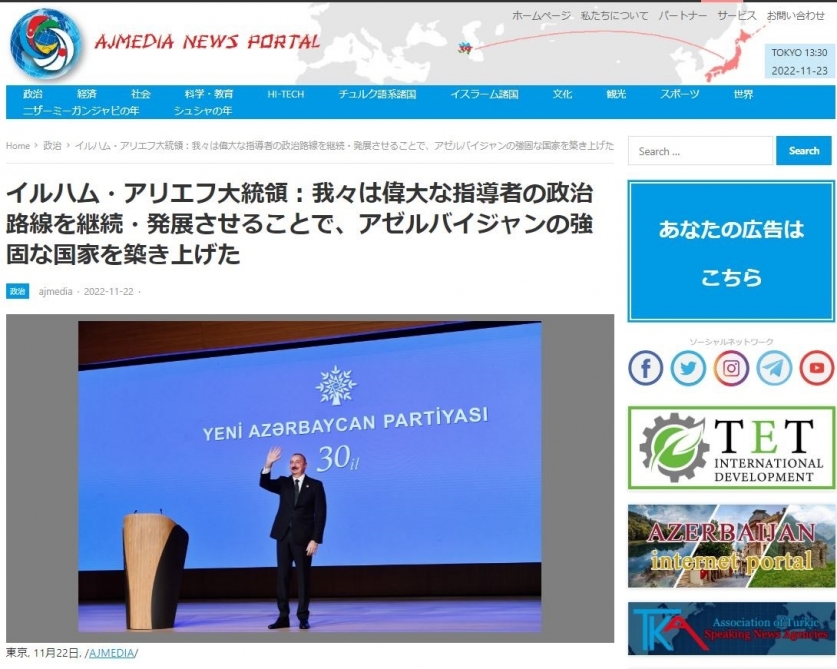 Yaponiyanın “ajmedia.jp” portalı Azərbaycan Prezidenti İlham Əliyevin Yeni Azərbaycan Partiyasının (YAP) 30-cu ildönümünə həsr olunan tədbirdə nitqini geniş işıqlandırıb.
